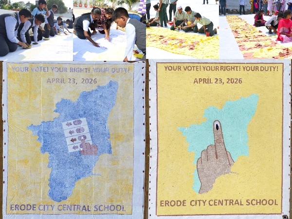 The landmark event, organised under the guidance of the Erode District Election Officer and District Collector in association with Erode City Central School, drew over 3,000 students, parents, and members of the public, who together brought to life two monumental works of art under the unifying theme: "Your Vote! Your Right! Your Duty!"